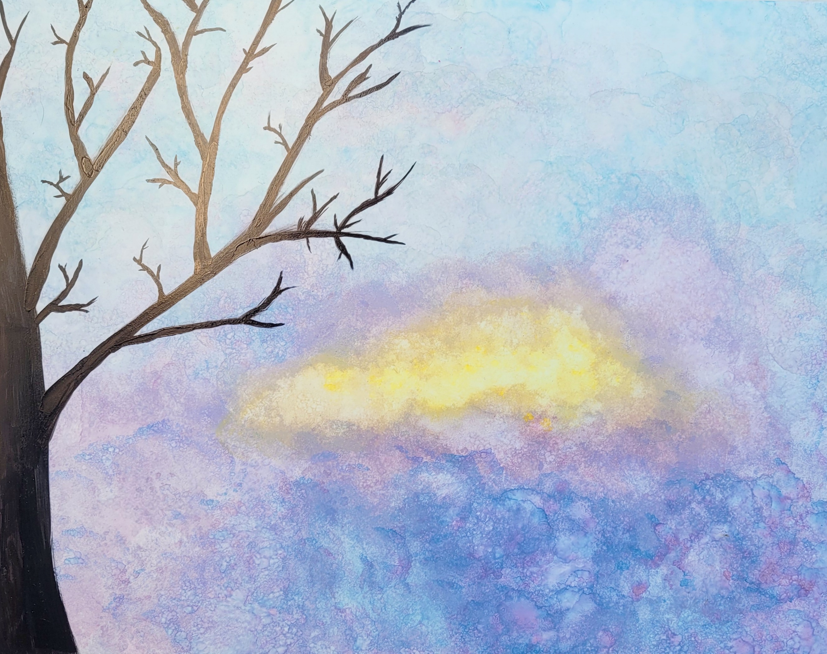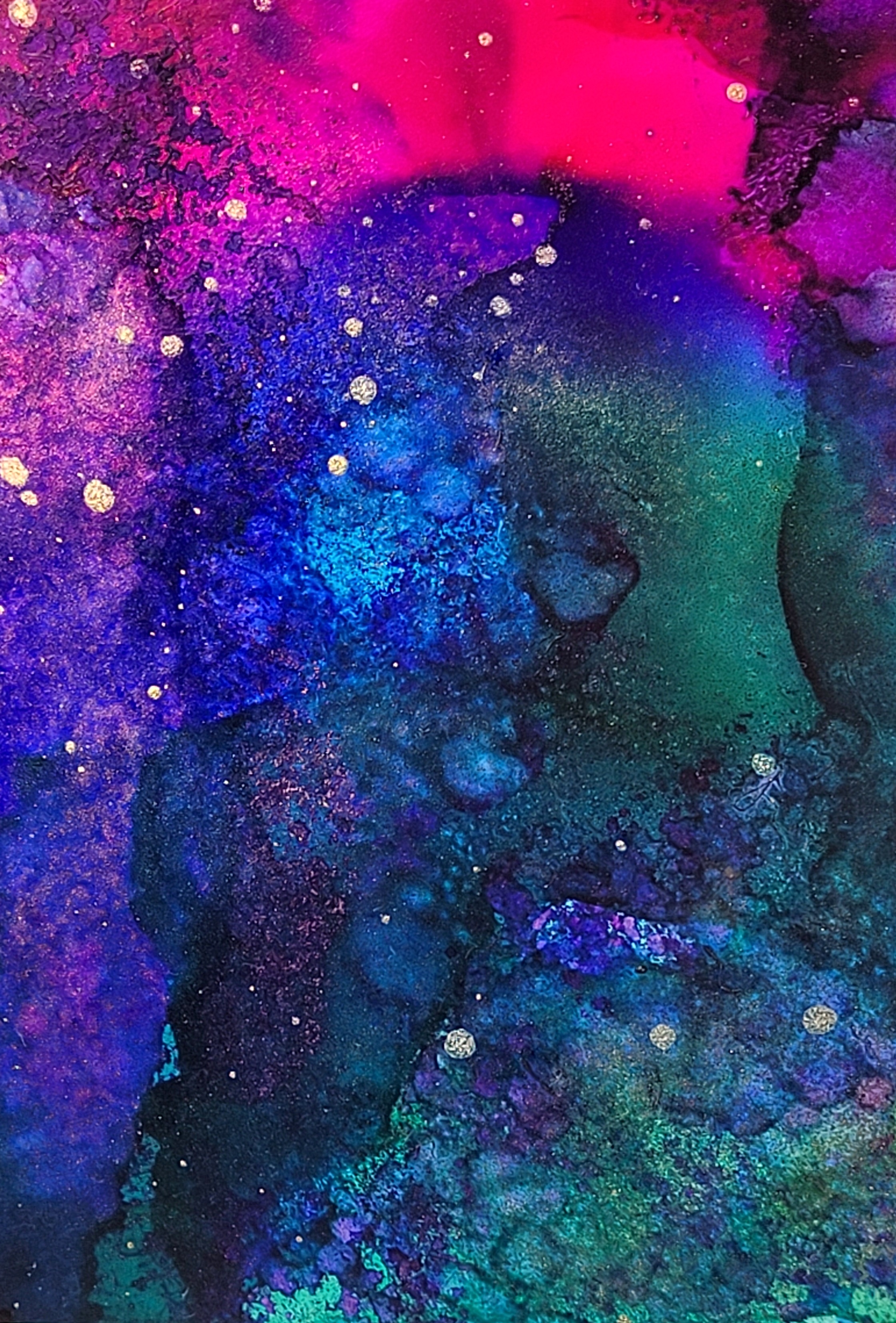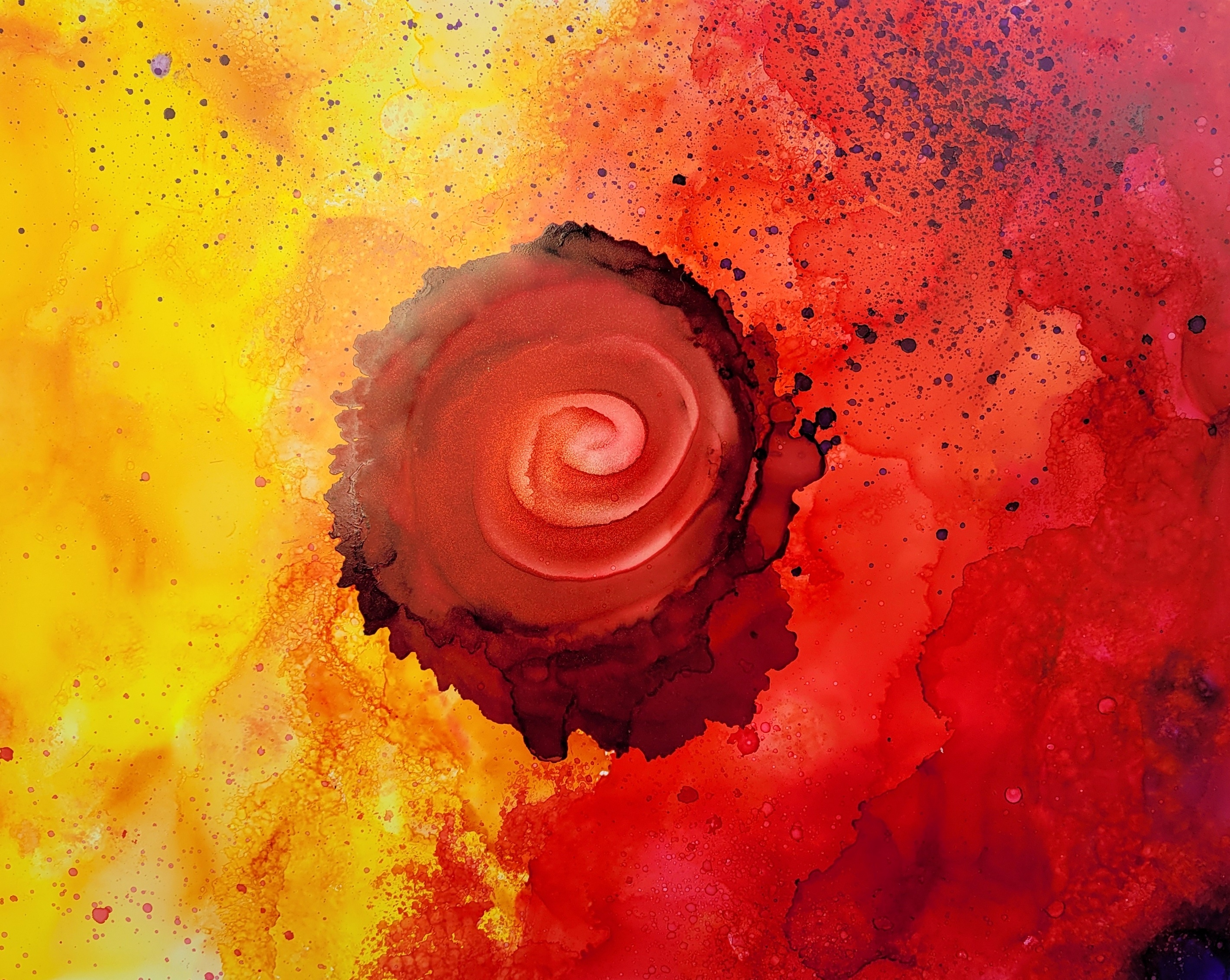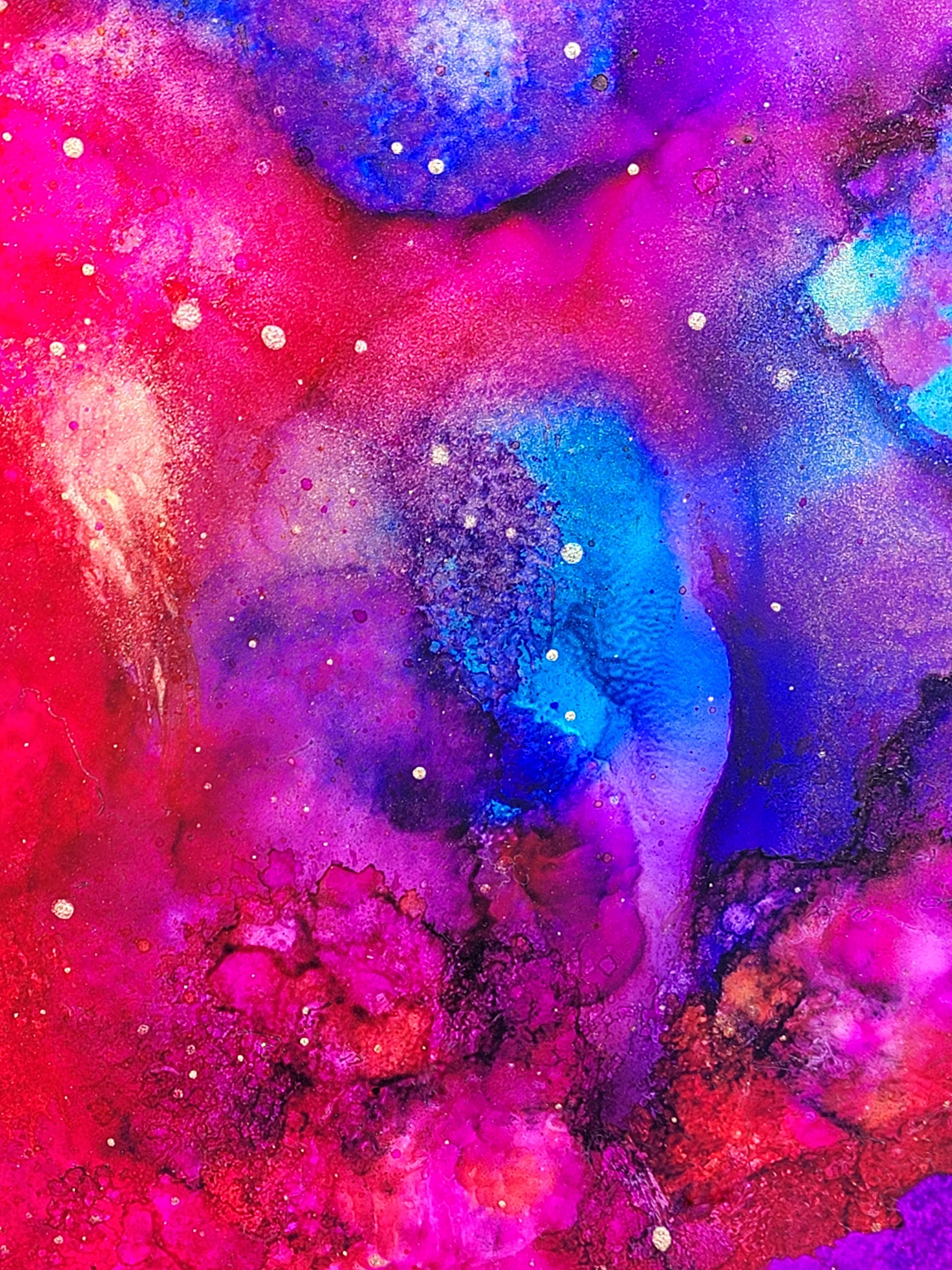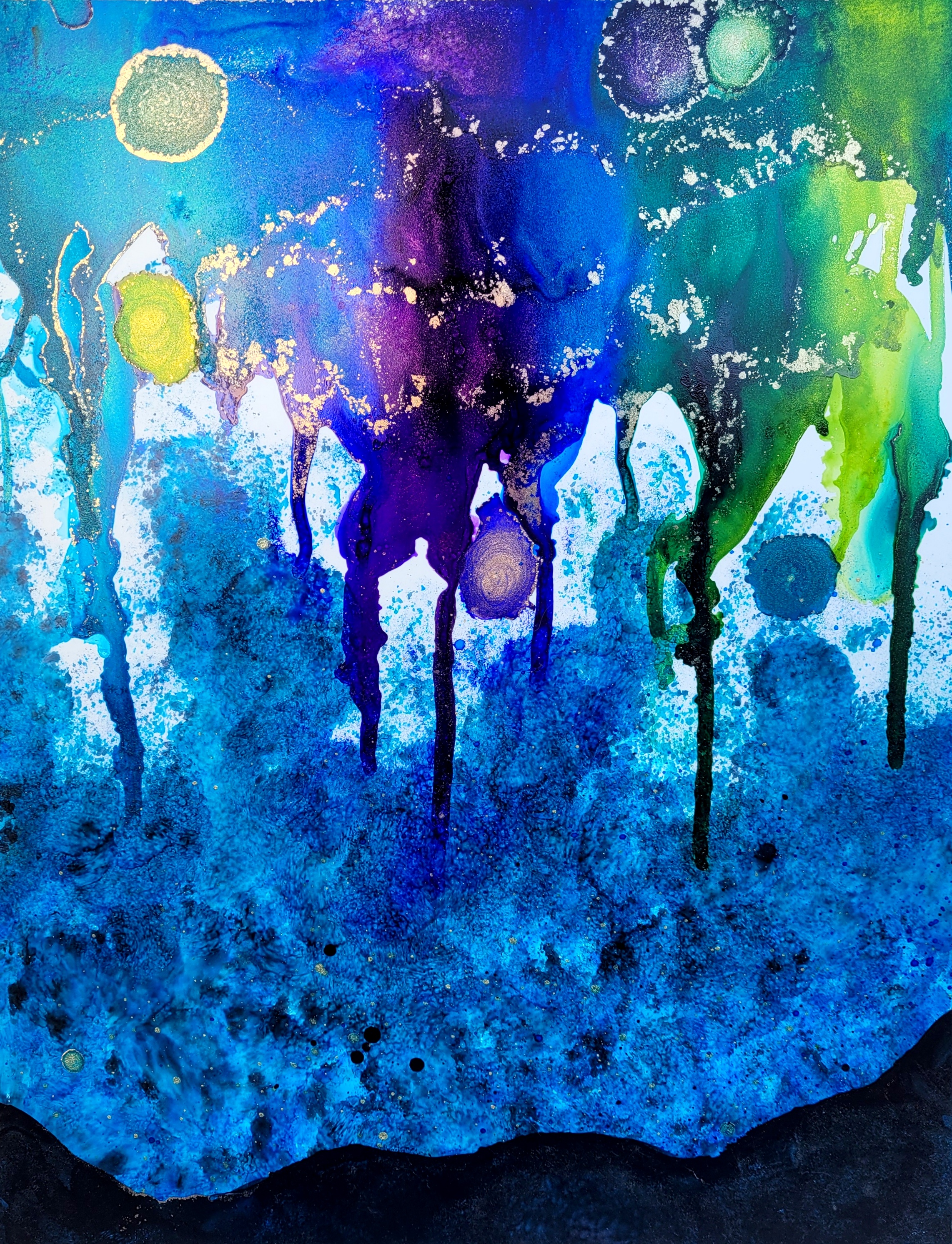 Next is my latest chromesthetic piece. This is as close as I can get to painting the synesthetic impression of “Be Right Now” by Ed Sheeran — at least as it unfolds in my head. It’s impossible to capture perfectly, but alcohol inks get closer than many other paints/inks could. Here’s the whole painting as well as some detail shots.